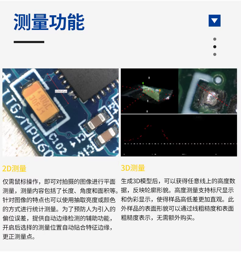 支持一键快速3D成像;支持图片大视野拼接(2D&3D);支持倾斜观测;优异的自动化设计,支持一键模版程序拍摄。软件支持平面及高度尺寸测量,精度可达微米级,支持粗糙度、共面度及平面度测量;支持AI自动量测及报告输出功能。